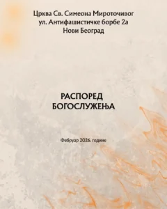 Распоред Богослужења | ФЕБРУАР 2026. 6.2. (петак) – Св. ксенија петроградска 07:00 – Јутрењеу наставку Света Литургија 7.2. (Субота) – св. Григорије богослов 08:00 – Јутрење 09:00 – Света Литургија